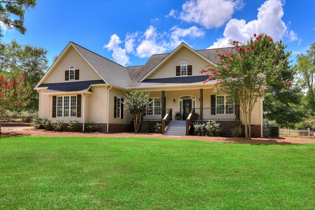 A rocking chair front porch offers a warm welcome to the home's front foyer, which is flanked by a formal dining room and leads to a spacious living room with vault ceiling and fireplace with gas logs. The fireplace is accented with shiplap and set off by a mantel handcrafted from solid cherry. Wood floors run throughout the living areas and kitchen, which features solid wood cabinets, granite counters, new stainless-steel appliances and adjacent breakfast room surrounded by windows.