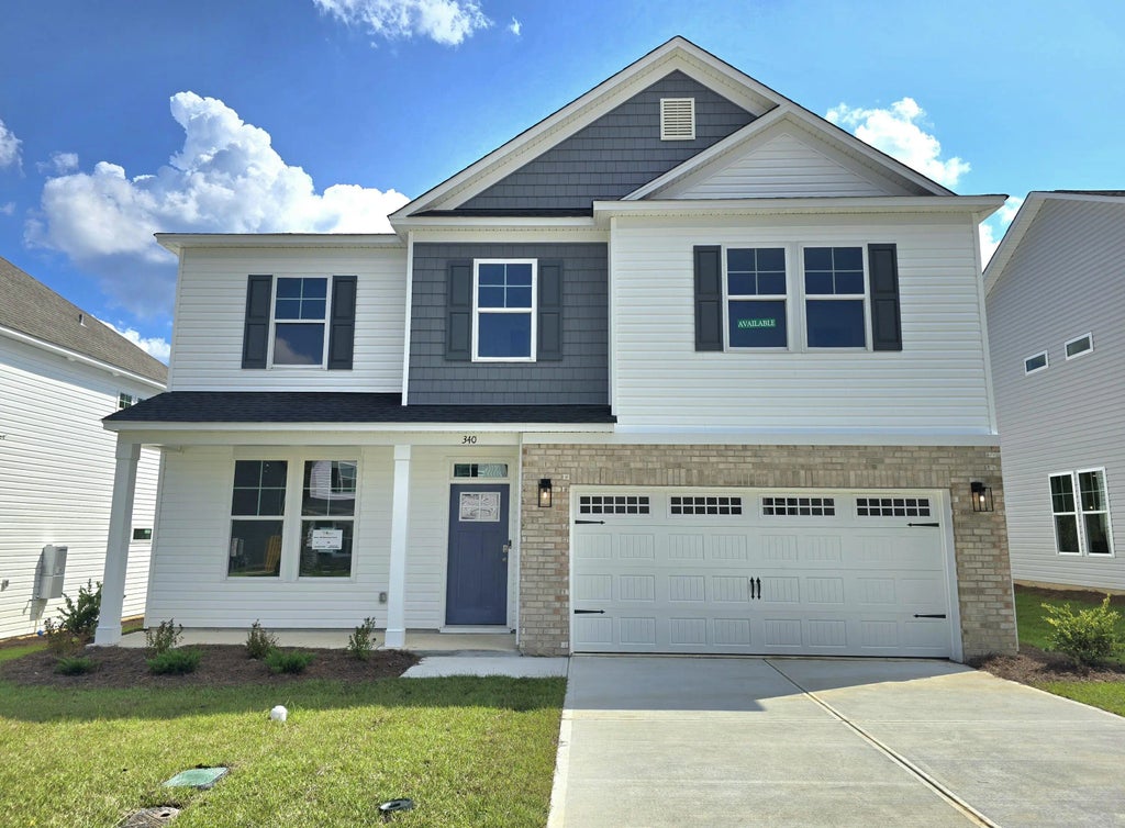 The Bradley II offers over 3,000 square feet of comfortable living space, thoughtfully designed with four bedrooms and three bathrooms. Several exterior elevations (A, B, B6, C, D, D4) are available, providing options for brick, stone, and siding combinations to personalize your home's curb appeal. The main level features an open floor plan, seamlessly connecting the spacious living room, dining area, and kitchen. A convenient den and powder room complete the main level. The expansive owner's suite is privately situated on the second floor, complete with a walk-in closet and an en-suite bathroom. Upstairs, you'll find three additional generously sized bedrooms that share a full bathroom, providing ample space for family members or guests. Optional upgrades enhance the already impressive features: a covered or screened patio extends your living space outdoors; a gas fireplace adds warmth and ambiance to the living room; and a kitchen island increases workspace and storage. An optional fifth bedroom or office provides extra versatility. The Bradley II effortlessly combines open living with private retreats, creating a home perfect for modern family living.