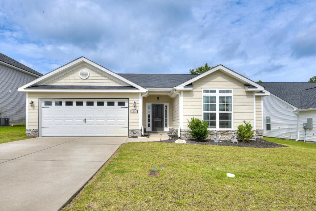 PRICE REDUCED! VA LOAN ASSUMPTION AVAILABLE. Adorable ranch home in amenity community, Haynes Station! Only two miles to Fort Gordon main gate! Open floor plan and wide plank LVP hardwood floors throughout main living areas, all bathrooms and laundry room. Eat-in kitchen features large island/breakfast bar, granite counters, subway tile backsplash and stainless steel appliances. Spacious great room with stone fireplace and cathedral ceiling. Huge 6x6 pantry with plenty of space for an extra appliance! Owner suite with trey ceiling and private bath that features double sinks, soaking tub, separate shower with door and large walk-in closet. Two guest bedrooms and a full bath off foyer. Laundry room with extra cabinet storage. Covered rear porch and patio area overlooks privacy fenced rear yard!