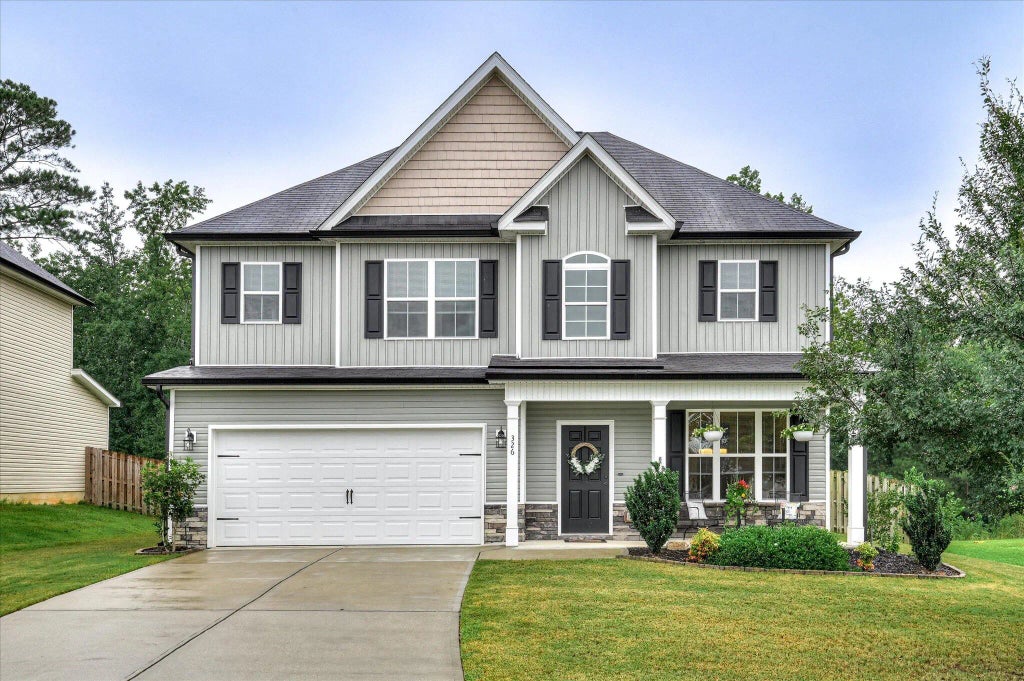 Gorgeous home in Grove Landing in pristine condition! Very open floor plan and tons of natural light. Formal dining room with coffered ceiling and LVP flooring. Kitchen with work island, tile backsplash, stained cabinetry, granite countertops, generous pantry, and stainless steel appliances. Kitchen is open to the breakfast room and the great room. Great room with fireplace, neutral walls, ceiling fan, and LVP flooring. Oversized primary bedroom suite features two closets, neutral walls and carpet, and ceiling fan. Three additional bedrooms are upstairs. Laundry room with upgraded shelving. Covered back porch overlooks huge, privacy fenced backyard that backs up to greenspace.